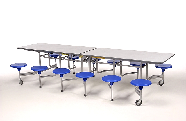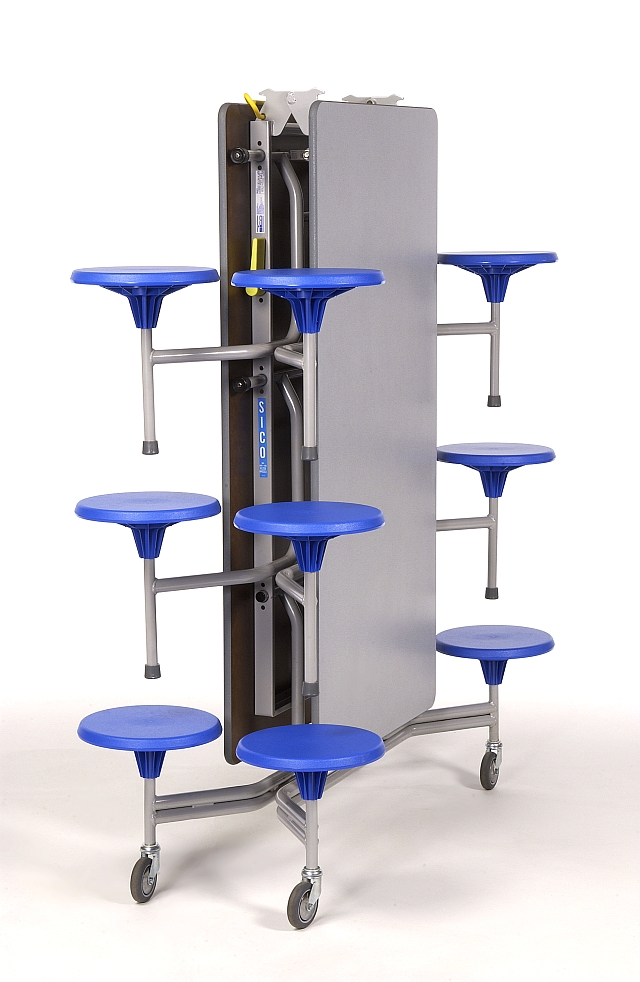 Das System ist so konzipiert, dass es auch von "zarter Frauenhand" ohne große Kraftanstrengungen auf- und zugeklappt werden kann. Die robusten und hochwertigen Rollen ermöglichen ein einfaches Verschieben. Zusammengeklappt lassen sich die Tische äußerst platzsparend lagern. Sie können so innerhalb kürzester Zeit eine Mensa in Ihrer Pausenhalle auf- und wieder abbauen.