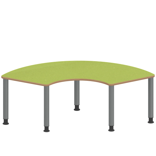 Drittelkreisförmige Tischplatte: 173 x 80 cm, Tischhöhe 41 cm, Tischbeine aus Stahlrohr Ø 60 mm. Sie besitzen eine pulverbeschichtete Oberfläche in RAL 9006. Der Tisch ist mit der Tischfußvariante ''manuell höhenverstellbar bis +14 cm'' ausgestattet. Der Drittelkreis-Tisch mit dem Außendurchmesser 200 cm und Innen-Ø 80 cm steht auf 5 Beinen. Für die Planung von Stellkombinationen: die 2 geraden Anstellseiten sind je 60 cm lang.