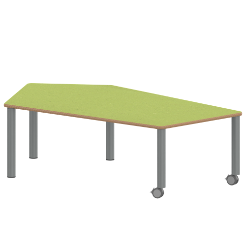 Fünfeckige große Tischplatte: 184 x 104 cm, Tischhöhe 25 cm, Tischbeine aus Stahlrohr Ø 60 mm. Sie besitzen eine pulverbeschichtete Oberfläche in RAL 9006. Der Tisch ist mit der Tischfußvariante ''fahrbar'' ausgestattet. Der Fünfecktisch besitzt für eine hohe Kippsicherheit 5 Beine. Für Stellkombinationen stehen folgende Kantenlängen zur Verfügung (Nennungen ab rechtem Winkel im Uhrzeigersinn): 80, 140, 80, 60, 140 cm.