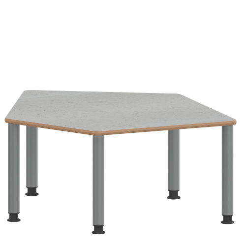 Fünfeckige kleine Tischplatte: 121 x 110 cm, Tischhöhe 53 cm, Tischbeine aus Stahlrohr Ø 60 mm. Sie besitzen eine pulverbeschichtete Oberfläche in RAL 9006. Der Tisch ist mit der Tischfußvariante ''manuell höhenverstellbar bis +14 cm'' ausgestattet. Der Fünfecktisch besitzt für eine hohe Kippsicherheit 5 Beine. Für Stellkombinationen stehen folgende Kantenlängen zur Verfügung (Nennungen ab rechtem Winkel im Uhrzeigersinn): 79, 60, 80, 80, 81 cm.
