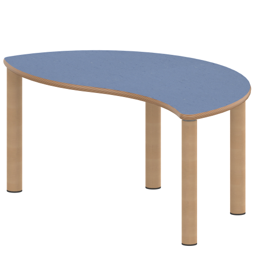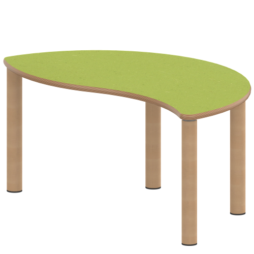 Halbrunde Wellen-Tischplatte: 120 x 60 cm (Systemmaß) / Stellfläche 120 x 68 cm, Tischhöhe 25 cm, Tischbeine aus Massivholz Ø 60 mm. Die Holzoberfläche ist mehrfach lackiert. Der Tisch ist mit der Tischfußvariante ''Stellfuß'' zum Ausgleich von Bodenunebenheiten ausgestattet.
