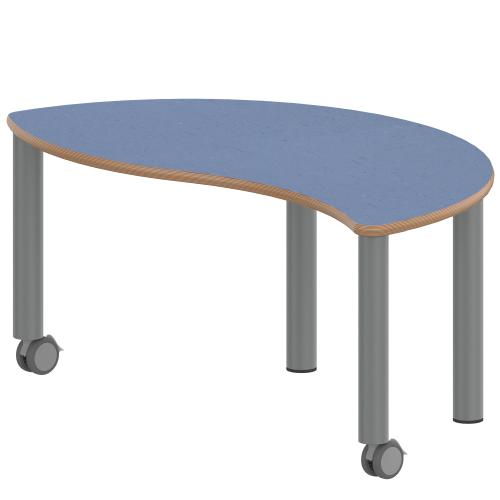 Halbrunde Wellen-Tischplatte: 120 x 60 cm (Systemmaß) / Stellfläche 120 x 68 cm, Tischhöhe 25 cm, Tischbeine aus Stahlrohr Ø 60 mm. Sie besitzen eine pulverbeschichtete Oberfläche in RAL 9006. Der Tisch ist mit der Tischfußvariante ''fahrbar'' ausgestattet.