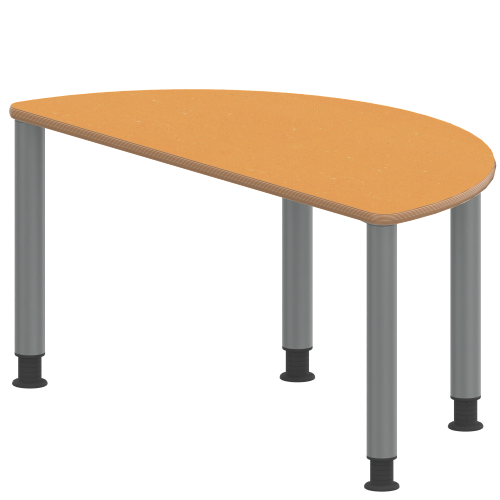 Halbrunde Tischplatte: 120 x 60 cm, Tischhöhe 41 cm, Tischbeine aus Stahlrohr Ø 60 mm. Sie besitzen eine pulverbeschichtete Oberfläche in RAL 9006. Der Tisch ist mit der Tischfußvariante ''manuell höhenverstellbar bis +14 cm'' ausgestattet.