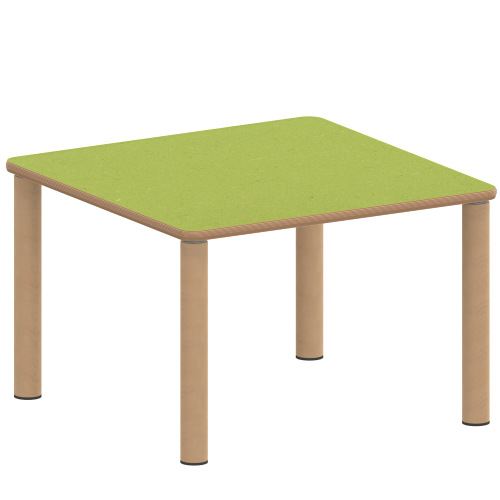 Quadratische Tischplatte: 60 x 60 cm, Tischhöhe 25 cm, Tischbeine aus Massivholz Ø 60 mm. Die Holzoberfläche ist mehrfach lackiert. Der Tisch ist mit der Tischfußvariante ''Stellfuß'' zum Ausgleich von Bodenunebenheiten ausgestattet.