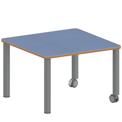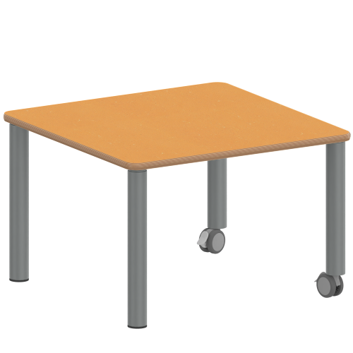 Quadratische Tischplatte: 60 x 60 cm, Tischhöhe 25 cm, Tischbeine aus Stahlrohr Ø 60 mm. Sie besitzen eine pulverbeschichtete Oberfläche in RAL 9006. Der Tisch ist mit der Tischfußvariante ''fahrbar'' ausgestattet.