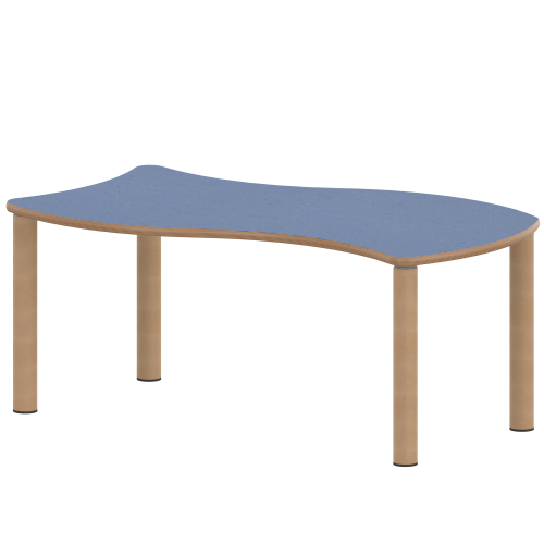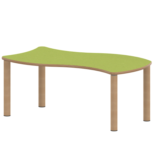 Rechteckige Wellen-Tischplatte: 120 x 60 cm (Systemmaß) / Stellfläche 126,7 x 76 cm, Tischhöhe 25 cm, Tischbeine aus Massivholz Ø 60 mm. Die Holzoberfläche ist mehrfach lackiert. Der Tisch ist mit der Tischfußvariante ''Stellfuß'' zum Ausgleich von Bodenunebenheiten ausgestattet.