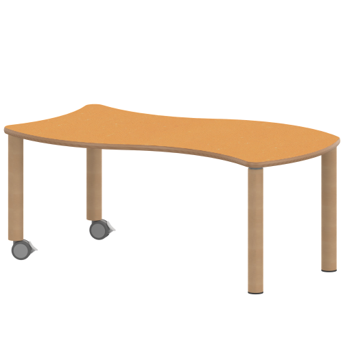 Rechteckige Wellen-Tischplatte: 120 x 60 cm (Systemmaß) / Stellfläche 126,7 x 76 cm, Tischhöhe 25 cm, Tischbeine aus Massivholz Ø 60 mm. Die Holzoberfläche ist mehrfach lackiert. Der Tisch ist mit der Tischfußvariante ''fahrbar'' ausgestattet.