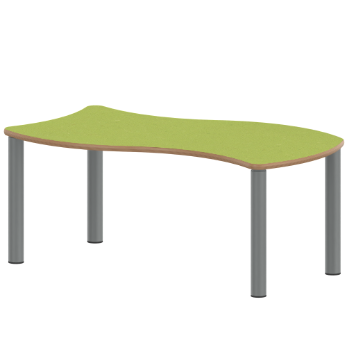 Die Wellenradien der Kontur betragen jeweils 60 cm. Dadurch ist der Tisch sowohl mit gleichen Produkten und als auch mit Wellenhalbrund-Tischen der ArtikelNr. ''TIX6WH126...'' in derselben Höhe problemlos kombinierbar.
