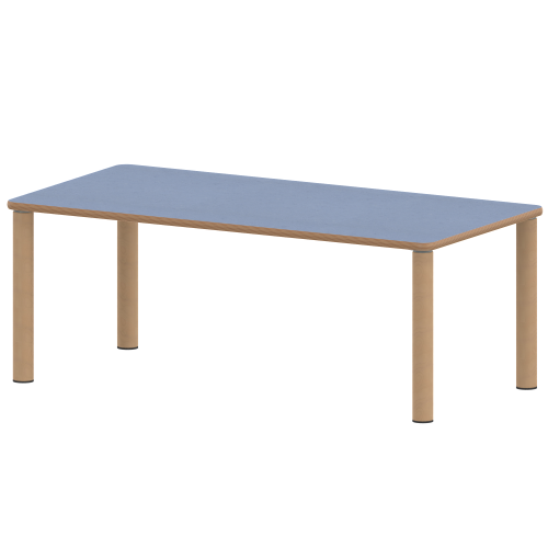 Rechteckige Tischplatte: 120 x 60 cm, Tischhöhe 25 cm, Tischbeine aus Massivholz Ø 60 mm. Die Holzoberfläche ist mehrfach lackiert. Der Tisch ist mit der Tischfußvariante ''Stellfuß'' zum Ausgleich von Bodenunebenheiten ausgestattet.