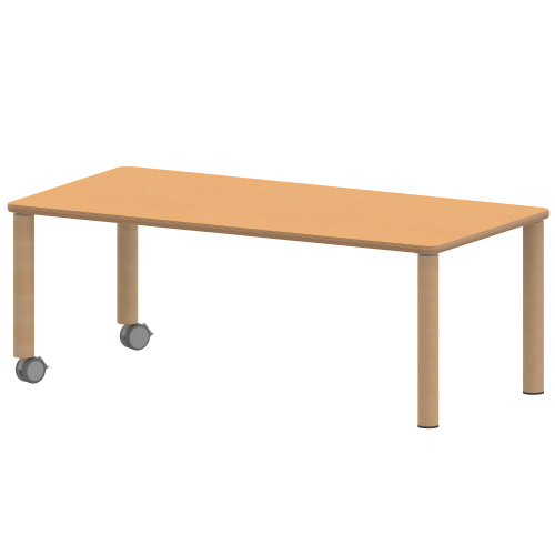 Rechteckige Tischplatte: 120 x 60 cm, Tischhöhe 25 cm, Tischbeine aus Massivholz Ø 60 mm. Die Holzoberfläche ist mehrfach lackiert. Der Tisch ist mit der Tischfußvariante ''fahrbar'' ausgestattet.