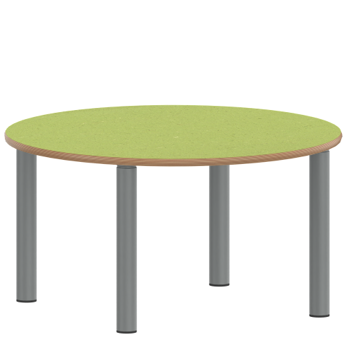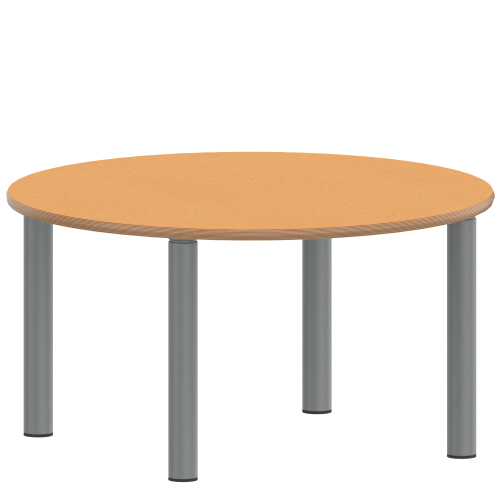 Kreisrunde Tischplatte: Ø 100 cm, Tischhöhe 25 cm, Tischbeine aus Stahlrohr Ø 60 mm. Sie besitzen eine pulverbeschichtete Oberfläche in RAL 9006. Der Tisch ist mit der Tischfußvariante ''Stellfuß'' zum Ausgleich von Bodenunebenheiten ausgestattet.