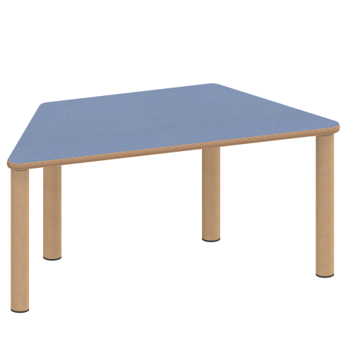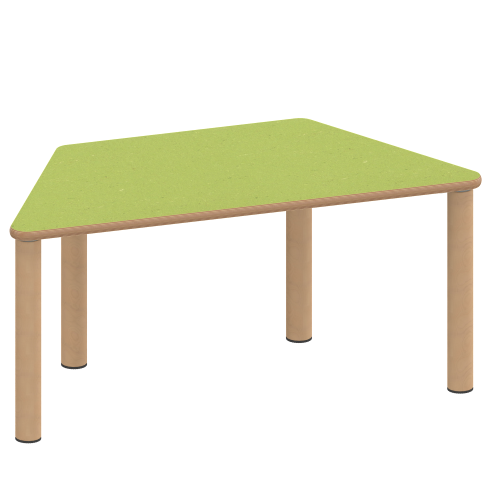 Trapezförmige Tischplatte: 120 x 60 cm (Systemmaß) / Stellfläche 114,2 x 52 cm, Tischhöhe 25 cm, Tischbeine aus Massivholz Ø 60 mm. Die Holzoberfläche ist mehrfach lackiert. Der Tisch ist mit der Tischfußvariante ''Stellfuß'' zum Ausgleich von Bodenunebenheiten ausgestattet. Für Stellkombinationen stehen als Kantenlängen 120 cm und 3 x 60 cm zur Verfügung.