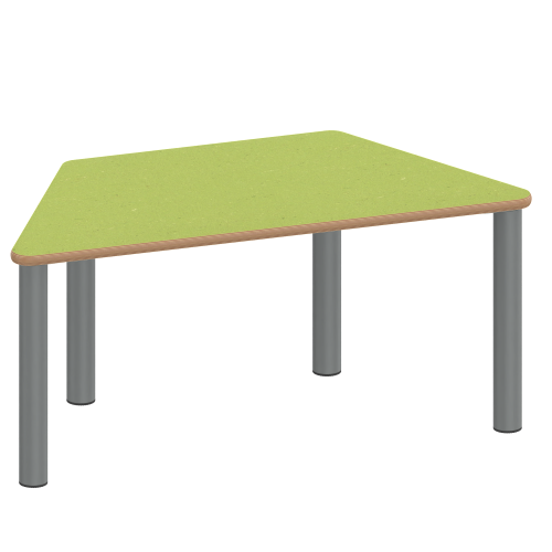 Trapezförmige Tischplatte: 120 x 60 cm (Systemmaß) / Stellfläche 94,2 x 52 cm, Tischhöhe 25 cm, Tischbeine aus Stahlrohr Ø 60 mm. Sie besitzen eine pulverbeschichtete Oberfläche in RAL 9006. Der Tisch ist mit der Tischfußvariante ''Stellfuß'' zum Ausgleich von Bodenunebenheiten ausgestattet. Für Stellkombinationen stehen als Kantenlängen 120 cm und 3 x 60 cm zur Verfügung.