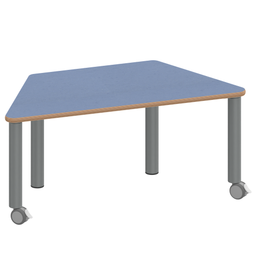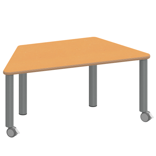 Trapezförmige Tischplatte: 120 x 60 cm (Systemmaß) / Stellfläche 114 x 52 cm, Tischhöhe 25 cm, Tischbeine aus Stahlrohr Ø 60 mm. Sie besitzen eine pulverbeschichtete Oberfläche in RAL 9006. Der Tisch ist mit der Tischfußvariante ''fahrbar'' ausgestattet. Für Stellkombinationen stehen als Kantenlängen 120 cm und 3 x 60 cm zur Verfügung.