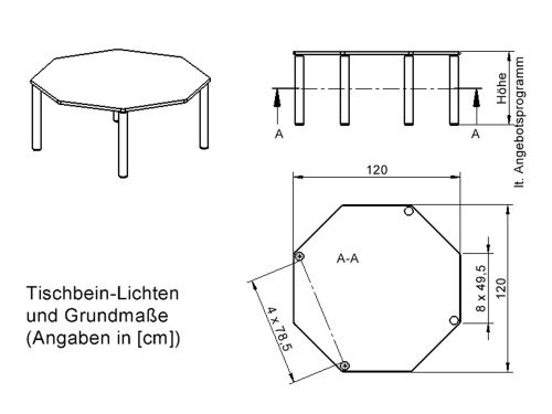 Achtecktisch, B/H/T: 120x41x120 cm, Stahlrohrbeine Ø 60 mm, Fußvariante: höhenverstellbar (41/55 cm)