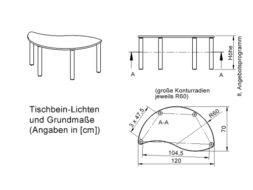 Die Wellenradien der Kontur betragen jeweils 60 cm. Dadurch ist der Tisch sowohl mit gleichen Produkten und als auch mit Wellenrechteck-Tischen der ArtikelNr. ''TIX6WR126...'' in derselben Höhe problemlos kombinierbar.