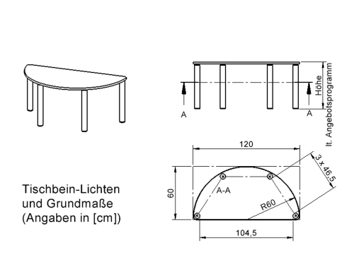 Halbrunde Tischplatte: 120 x 60 cm, Tischhöhe 25 cm, Tischbeine aus Stahlrohr Ø 60 mm. Sie besitzen eine pulverbeschichtete Oberfläche in RAL 9006. Der Tisch ist mit der Tischfußvariante ''fahrbar'' ausgestattet.