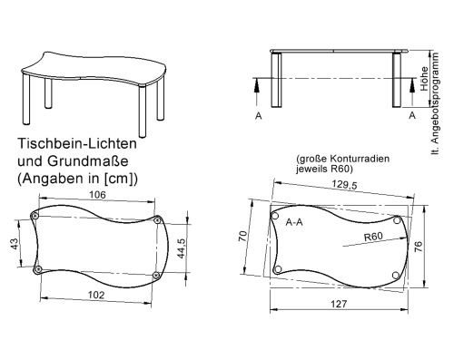 Die Wellenradien der Kontur betragen jeweils 60 cm. Dadurch ist der Tisch sowohl mit gleichen Produkten und als auch mit Wellenhalbrund-Tischen der ArtikelNr. ''TIX6WH126...'' in derselben Höhe problemlos kombinierbar.