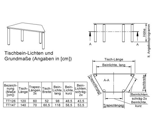 Trapezförmige Tischplatte: 120 x 60 cm (Systemmaß) / Stellfläche 114,2 x 52 cm, Tischhöhe 41 cm, Tischbeine aus Stahlrohr Ø 60 mm. Sie besitzen eine pulverbeschichtete Oberfläche in RAL 9006. Der Tisch ist mit der Tischfußvariante ''manuell höhenverstellbar bis +14 cm'' ausgestattet. Für Stellkombinationen stehen als Kantenlängen 120 cm und 3 x 60 cm zur Verfügung.