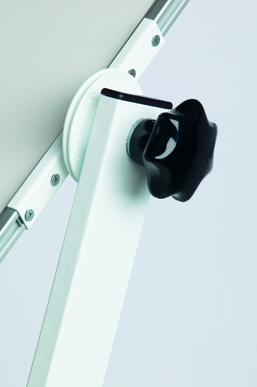 Unsere Drehtafel ist beidseitig mit Whiteboardoberflächen versehen. Die Oberflächen sind stahlemailliert und dadurch kratzfest, mit Boardmarkern beschreibbar und trocken abwischbar. Natürlich haften auch Magnete an ihr. Die Rollen sind kugelgelagert, so bleiben Sie nicht an Türschwellen hängen, außerdem laufen die Rollen sehr leise. 2 Rollen sind feststellbar. Die Tafel lässt sich um 360 Grad drehen und in jedem gewünschten Winkel fixieren. Das Gestell verfügt über eine lange Ablageleiste.