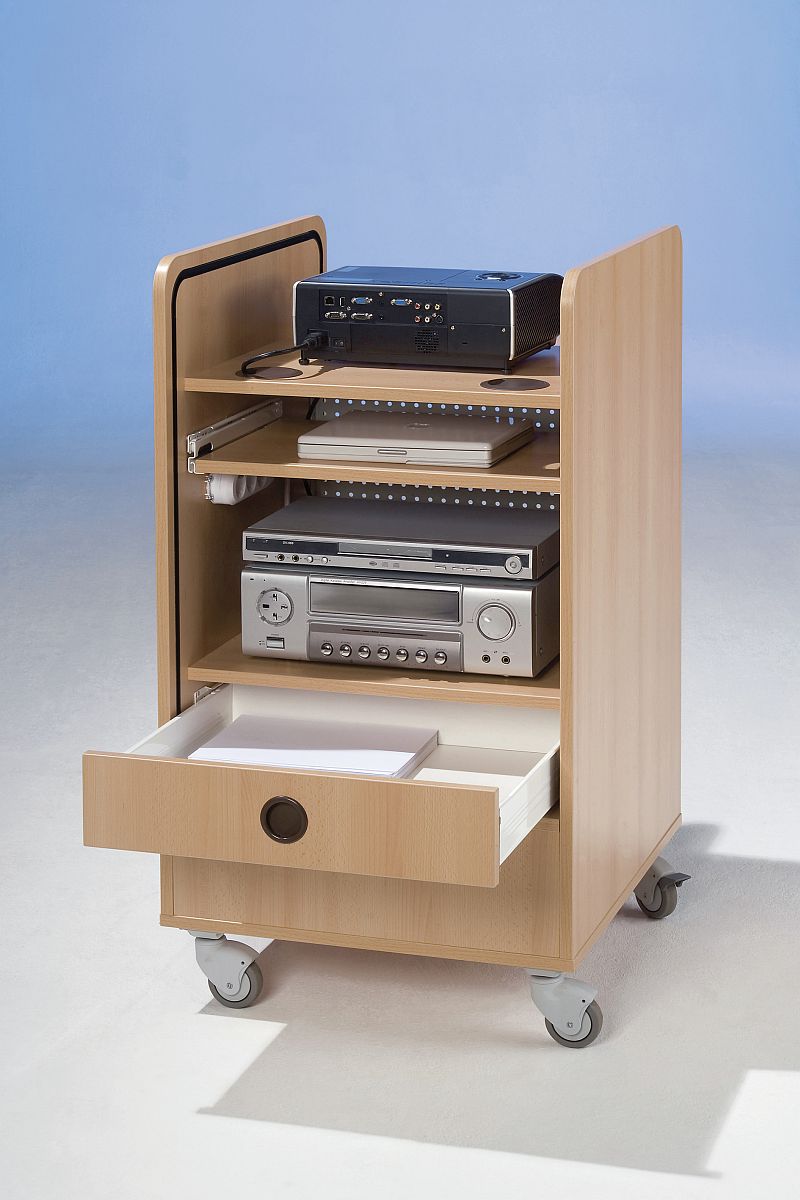 Hochwertiger Medienwaggen mit Kabeldurchlässen, Steckdosenleiste 3-fach, Lochblechfront und abschließbarem Rollo.