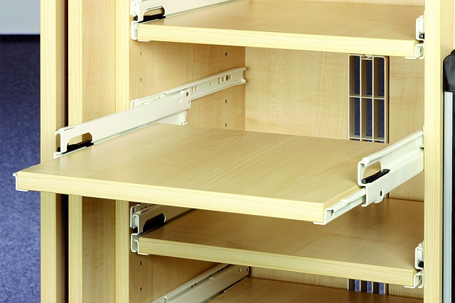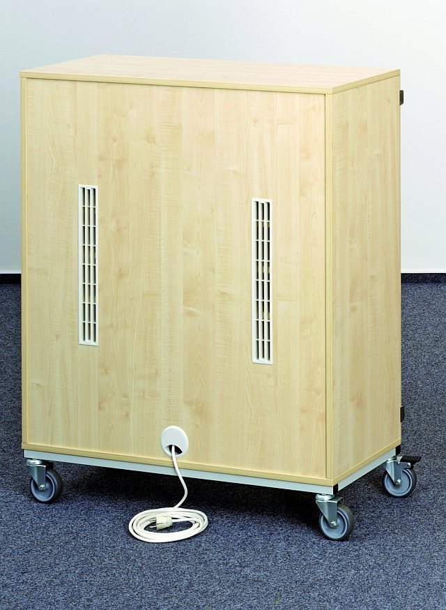 Platz für bis zu 16 Latops bietet unser Laptop-Locker. Die Geräte können bis 17 Zoll Bildschirmgröße besitzen um bequem in den einzelnen Fächern verstaut zu werden. Selbstverständlich sind Steckdosen im Holzkorpus integriert. Es sind außerdem verschiedene Korpusdekore verfügbar, bitte wählen Sie oben rechts Ihr Wunschdekor. Natürlich wird der Korpus mit hochwertigen Transportrollen geliefert, damit Türschwellen keine Hindernisse darstellen. Die Außenmaße betragen 135 x 42 x 125 cm (BxTxH).